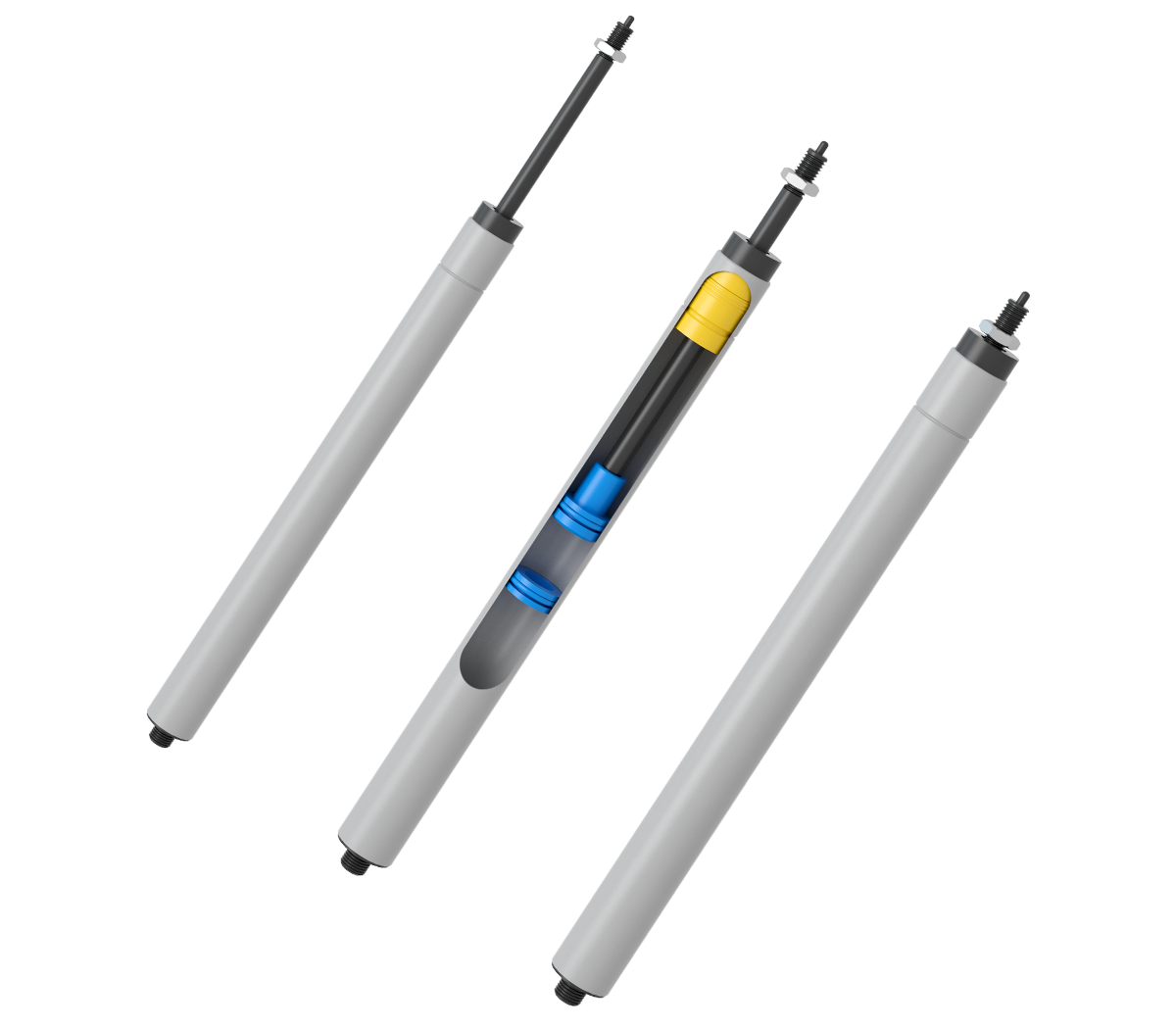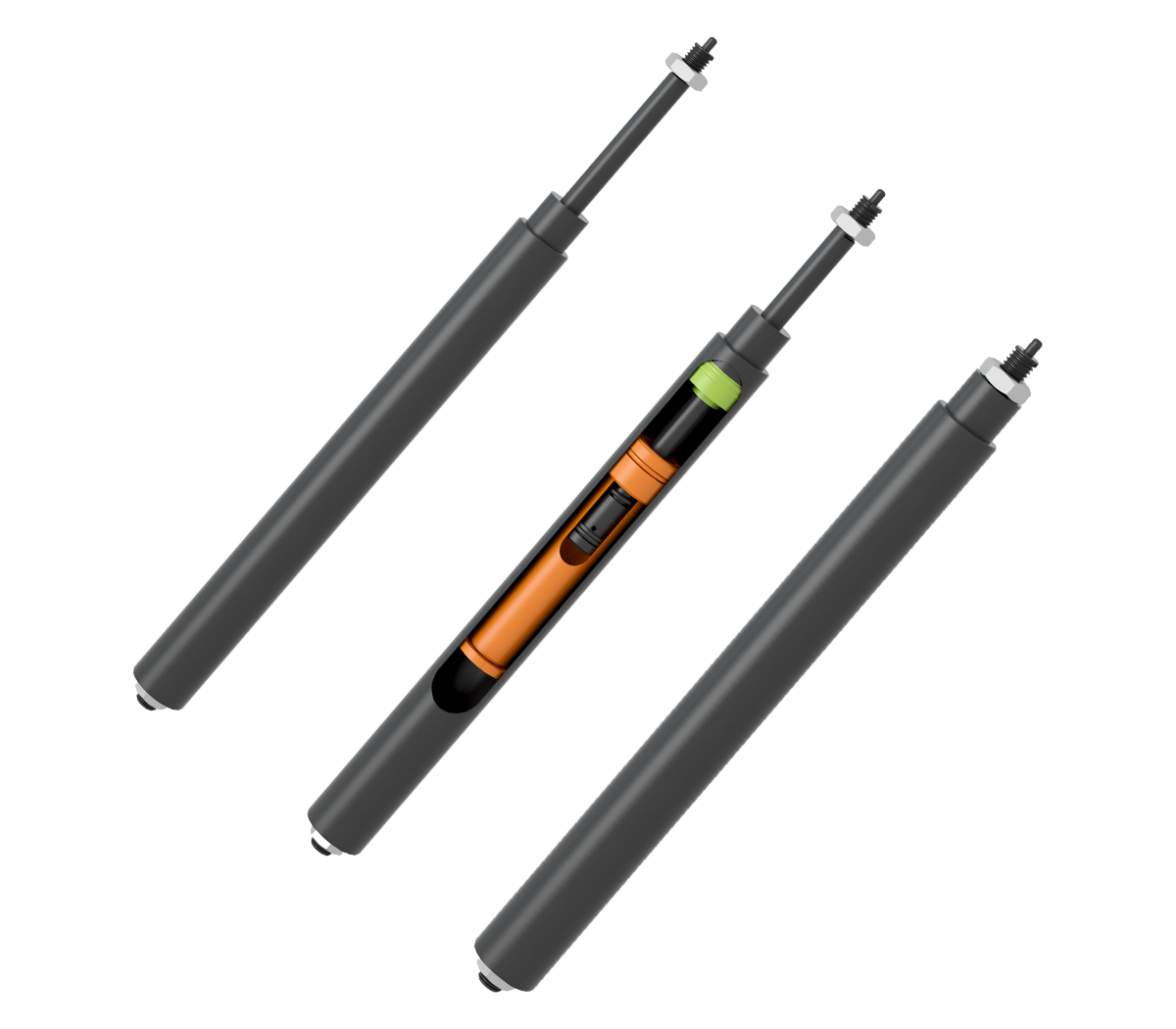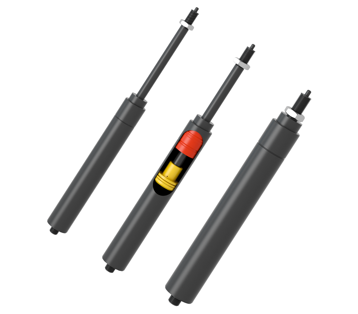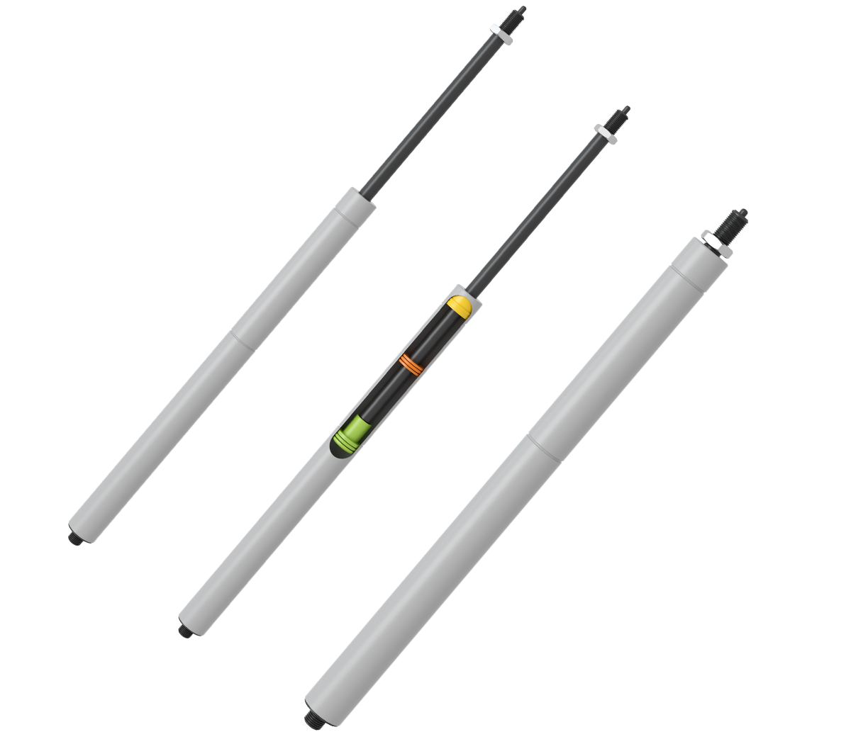 Its characteristic is that it can be rigidly locked in the stretching direction. Due to the small gas space and small compressible range, the locking force in the compression direction is relatively large. The elastic ratio can be adjusted according to the change of the position of the floating piston. The disadvantage is that for a certain length of cylinder body, the stroke is relatively small and the ratio of stroke to cylinder body is relatively large. It can be applied to any mechanical mechanism that requires angle adjustment, vertical height adjustment, or horizontal adjustment and at the same time has rigid locking in the stretching direction or has a relatively large locking force in the compression direction. The two ends can be connected in multiple connection methods.